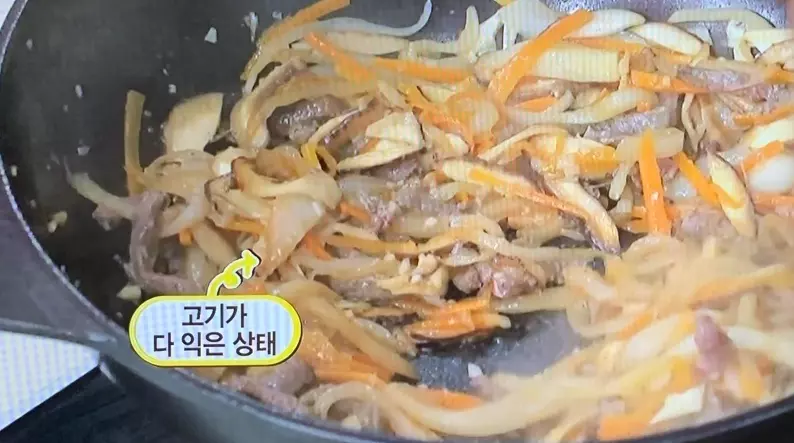 이제 당면이 조려질 동안 잡채에 들어갈 손질한 야채들과 고기를 넣고 볶아줍니다