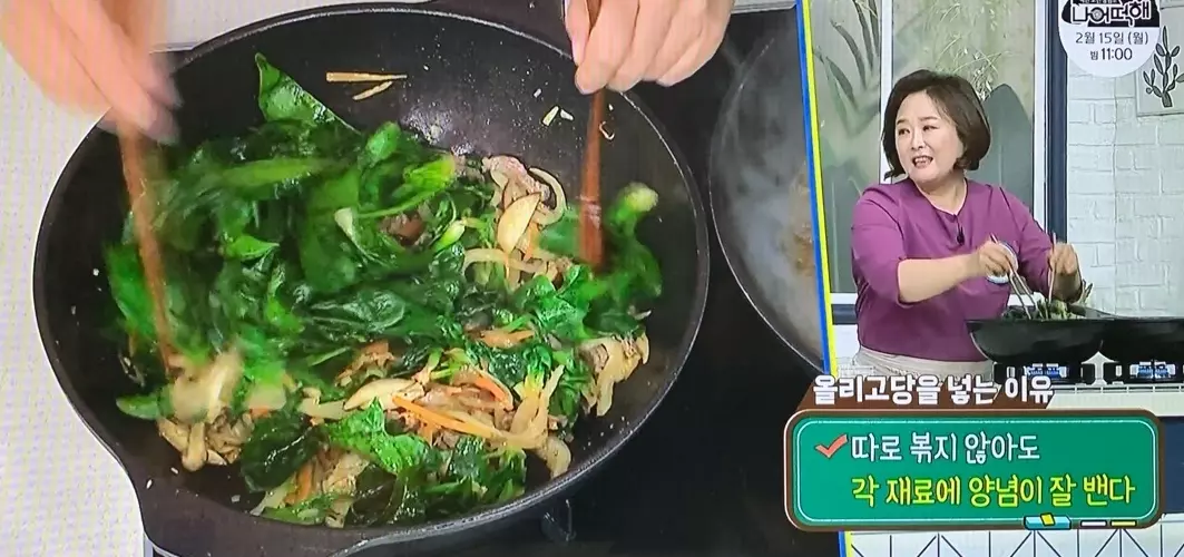 야채와 소고기가 다 볶아졌으면 데쳐놓았던 시금치를 넣고 한번에 볶아주는데 여기서 중요한 팁은 올리고당 1큰술 반을 넣고 볶아주는 것입니다